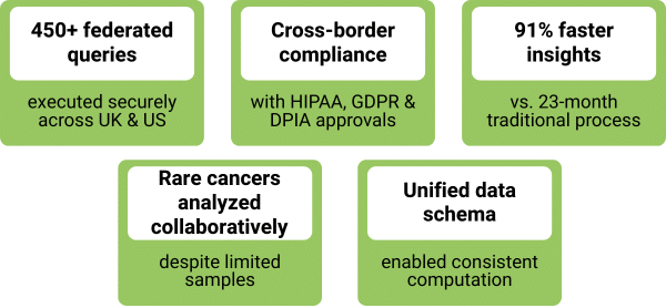 Using Duality’s Privacy-Enhancing Technologies platform, NHS England’s National Disease Registration Service (NDRS) and the US National Cancer Institute (NCI) securely collaborated on rare cancer research without moving sensitive data. The solution enabled cross-border analysis through federated computation and secure processing environments, preserving patient privacy while accelerating time-to-insight for oncology research.