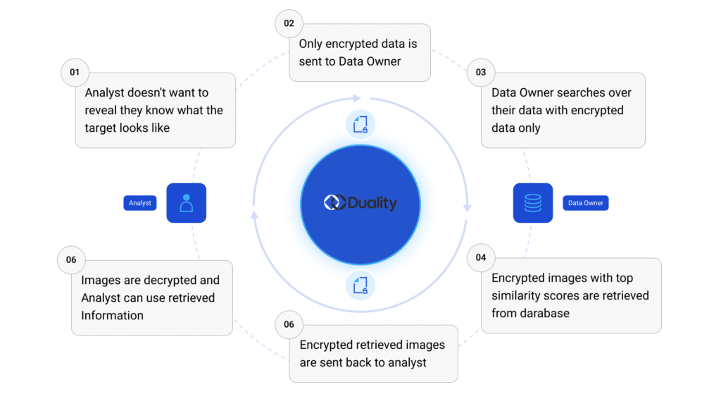 Search across diverse data types including: text reports and documents, images, videos, and satellite photos, and audio, call recordings, and structured records. Encrypted processing ensures privacy at every layer—across domains, partners, and jurisdictions.